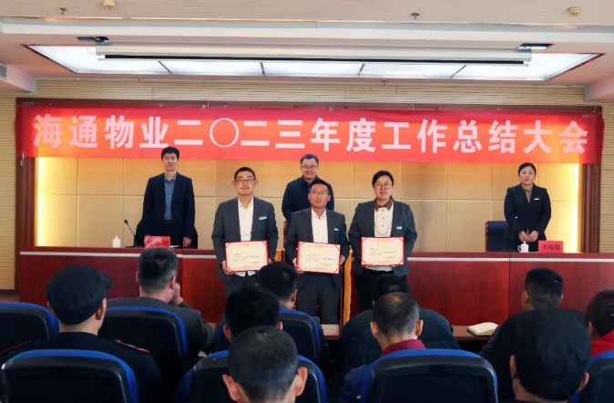 首先,由公司管理部经理李梅梅宣读了《关于表彰2023年度先进集体、优秀员工和优秀物业经理的决定》。海通智慧广场服务中心荣获2023年度“先进集体”称号,共有56名员工评为2023年度“优秀员工”,3名经理被评为2023年度“优秀物业经理”。公司领导为到场的优秀员工颁发了荣誉证书和奖金。
