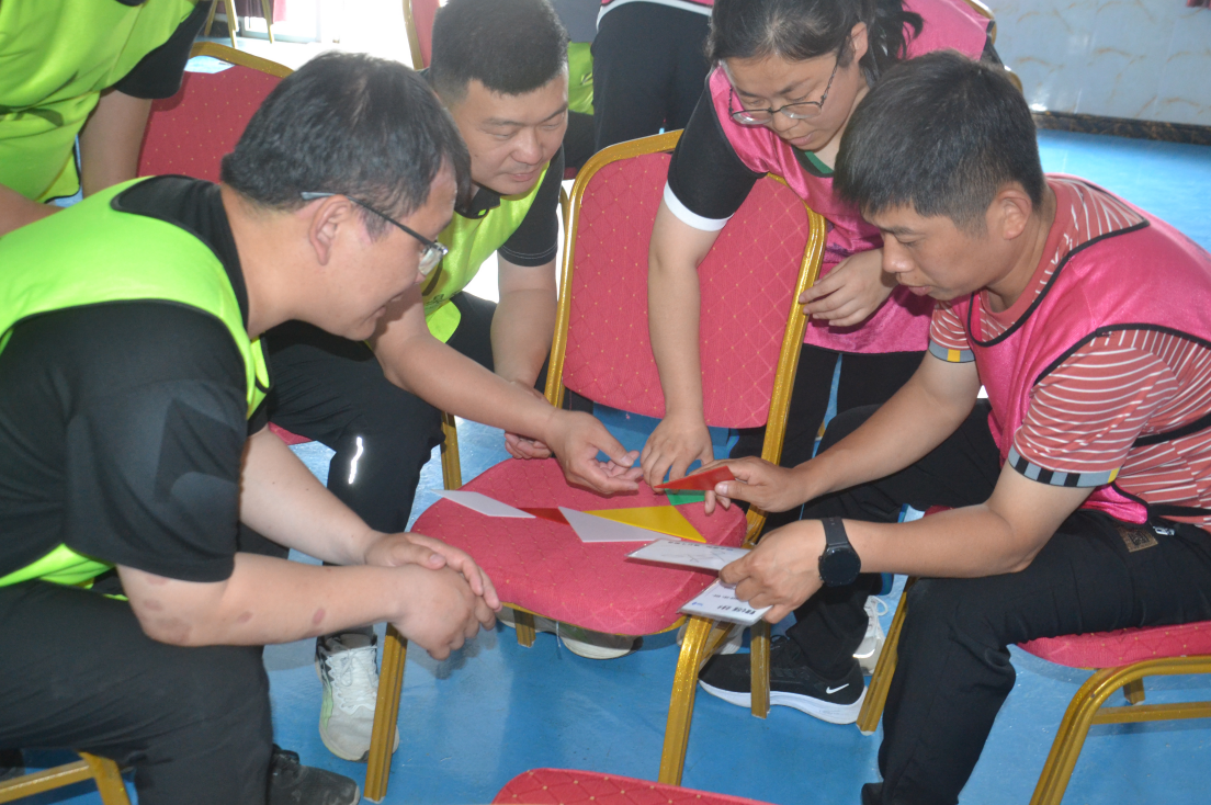 中午全体成员补充能量、稍作休息后,先进行了热身运动,然后开始了下午的第一个项目“管理七巧板”,这是一个非常经典的管理类的培训项目。通过将全体成员随机分成七个组,模拟企业中的不同分支机构,完成指定任务,过程之中体验沟通、团队合作、信息共享、资源配置、高效思维、领导风格、科学决策等管理主题。大家感慨万千,纷纷表达自己的看法,公司就是一个大团队,全体员工都要明确我们共同的目标,各个部门围绕着这个目标,去调动本部门的资源,分工协调,有效沟通,并以完美的执行力才能最终完成公司的目标。