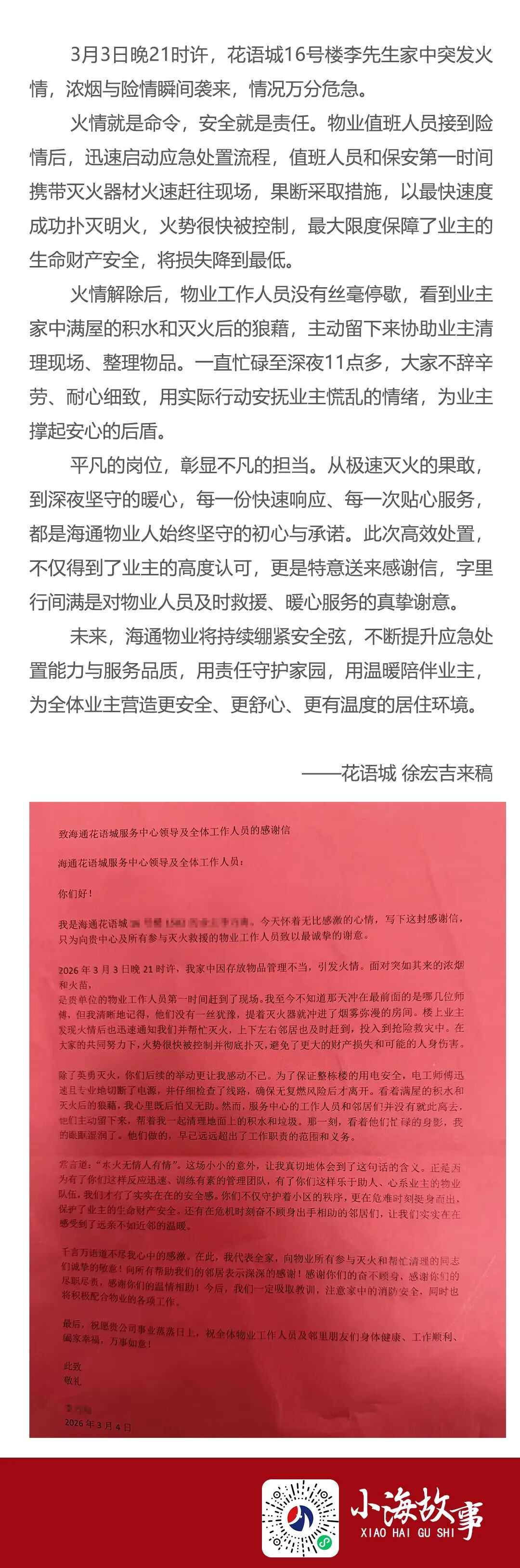 【小海故事】海通花语城:深夜火情勇担当 物业暖心护家园